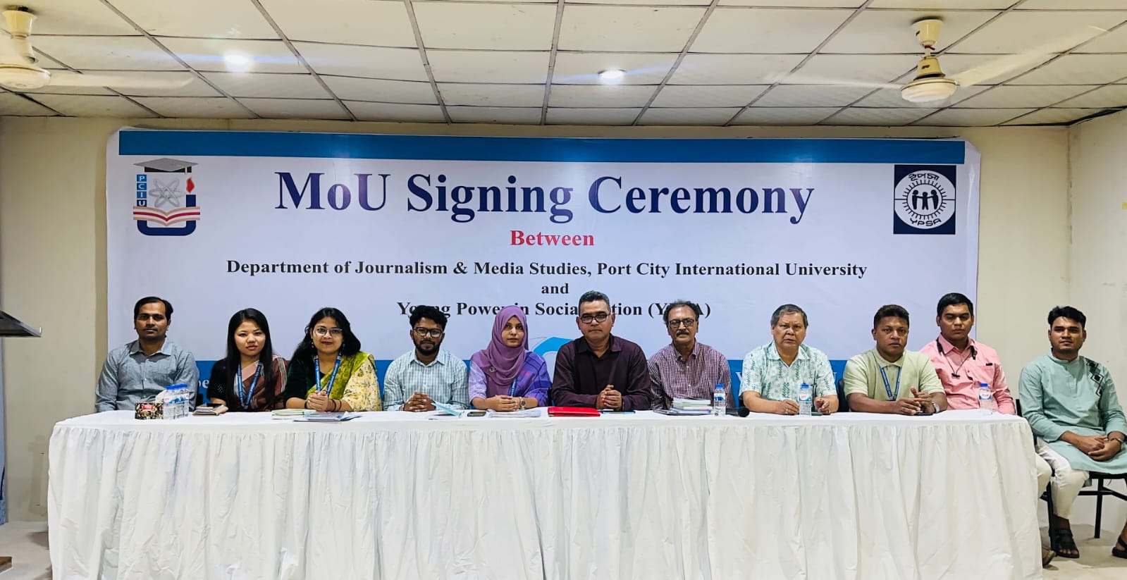 The Department of Journalism and Media Studies at Port City International University signed a Memorandum of Understanding (MoU) with Young Power in Social Action (YPSA) on 7th October 2025 at the university auditorium. The three-year MoU aims to promote joint initiatives in research, internships, and development communication. The ceremony was graced by Prof. Mainul Hasan Chowdhury, Dean of the Faculty of Humanities, Social Science and Law, and Prof. Dr. Ganesh Chandra Roy, Director of IQAC. The MoU was signed by Mr Mohammad Ali Shaheen, Focal Person of YPSA’s Advocacy Unit, and Dilruba Akter, Head of the Department. University proctor, faculty members, YPSA representatives, general secretary of PCIU Journalism Alumni Association, and students also joined the programme.