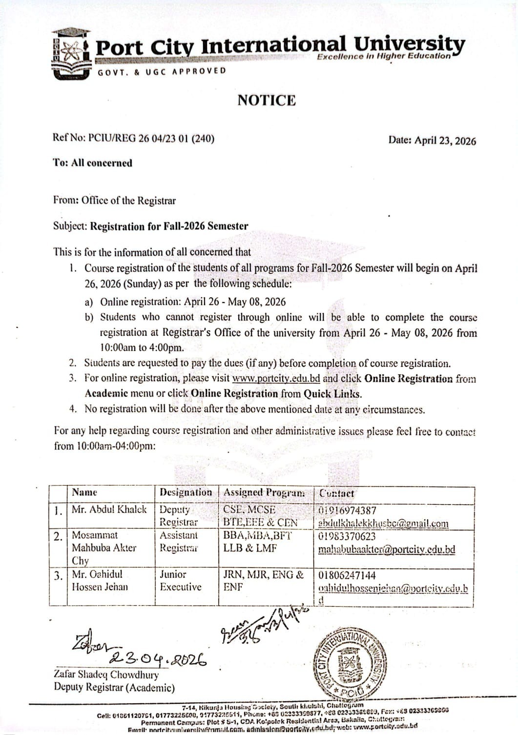 | 23-04-2026 | Registration fot Fall 2026 Semester | Office of the Registrar | Download | |