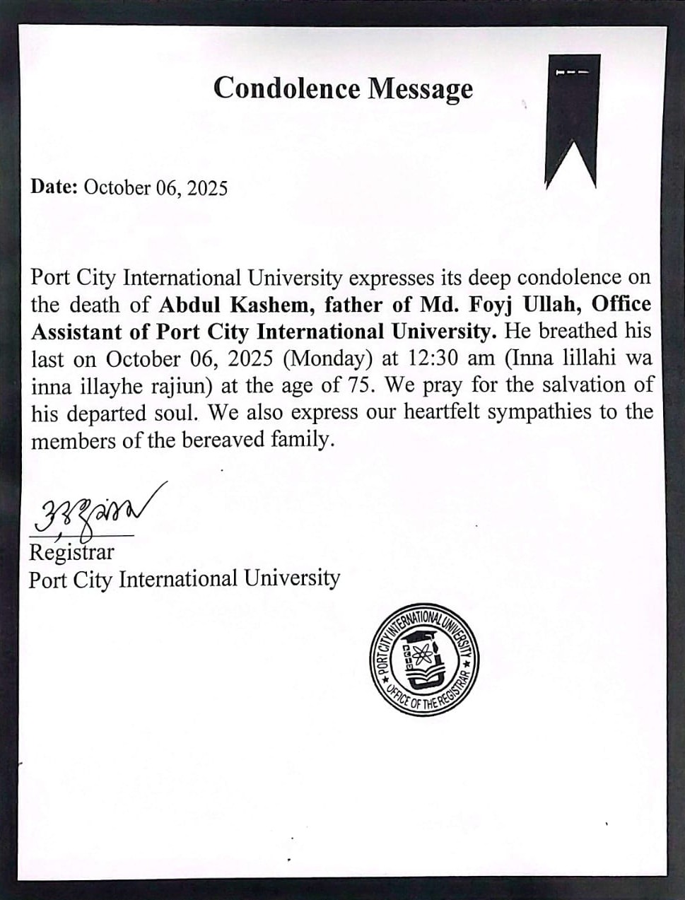 26-07-2025 | Condolence Message | Office of the Registrar | Download | |