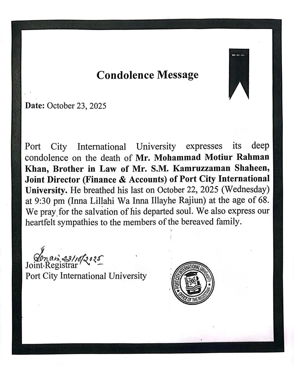 | 06-10-2025 | Condolence Message | Office of the Registrar | Download | |